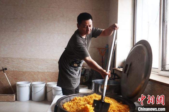 劉秀富正在攪拌原料。蒼雁 攝