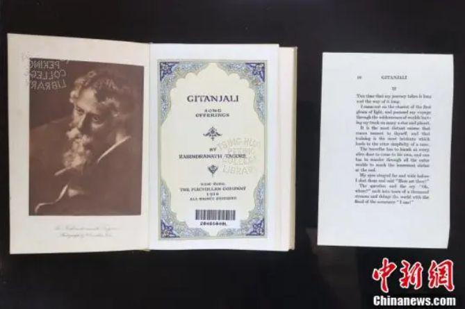 圖為清華大學(xué)圖書(shū)館收藏的紐約1916年英譯本泰戈?duì)栐?shī)集《吉檀迦利》。中新社記者 易海菲 攝