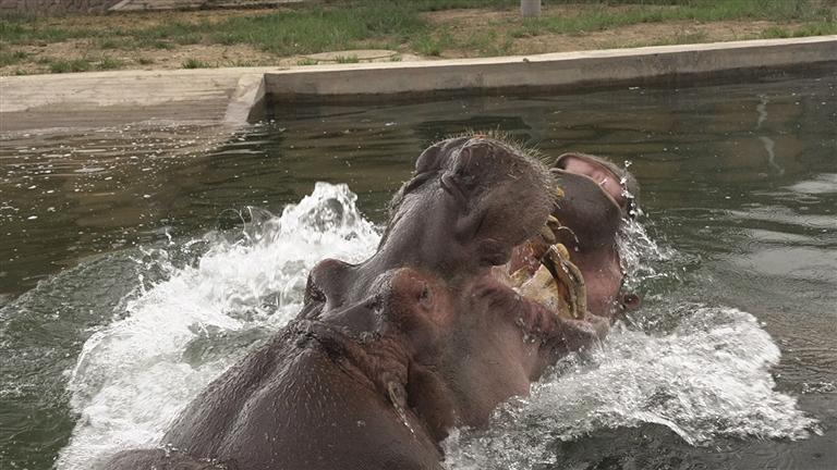 “小乖”今年正值青春活潑的年紀(jì),性格溫順可愛(ài)。經(jīng)過(guò)一段時(shí)間的精心準(zhǔn)備與適應(yīng)期,“小乖”已經(jīng)與老住戶(hù)“大嘴”和諧相處,一同在水中暢游、嬉戲玩耍,或是在岸邊悠閑進(jìn)食、曬著太陽(yáng)。兩只河馬的互動(dòng)與陪伴,給園區(qū)增加了許多樂(lè)趣,也給游客們帶來(lái)更加新奇、歡樂(lè)的觀賞體驗(yàn)。