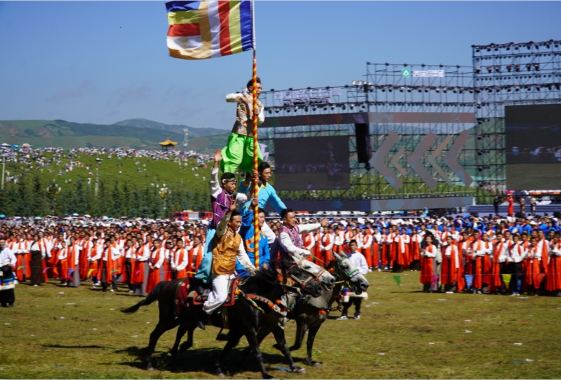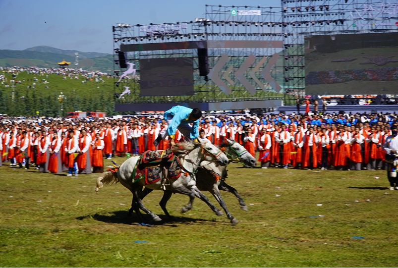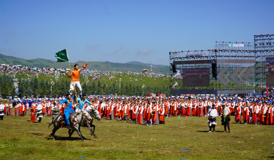 草原騎手乘著矯健的駿馬高舉著鮮艷的五星紅旗從主席臺前奔馳而過,讓在場的數(shù)萬觀眾贊嘆不已,呈現(xiàn)出一個絢麗多彩的甘南、和諧穩(wěn)定的甘南、朝氣蓬勃的甘南、包容開放的甘南、團(tuán)結(jié)奮進(jìn)的甘南。