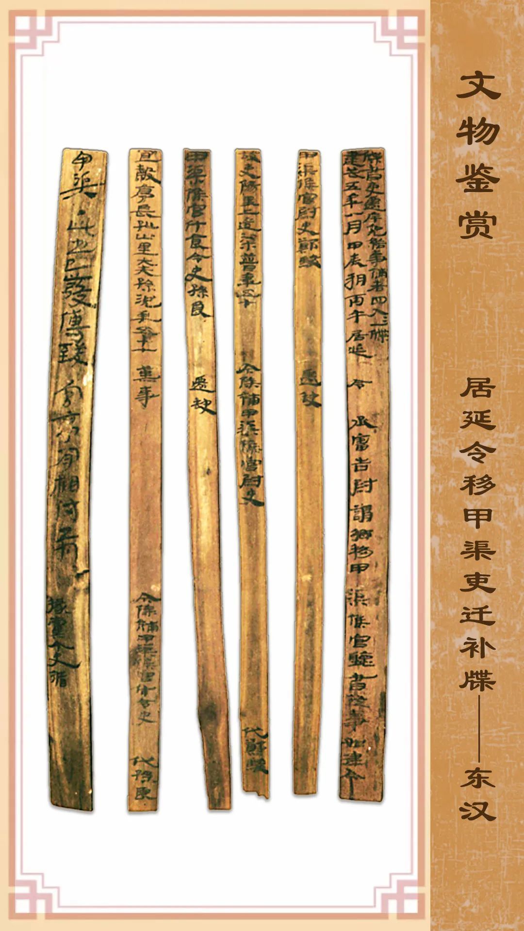 第一簡文字為:“牒書:吏遷、斥免、給事補者四人,人一牒。建武五年八月甲辰朔丙午,居延令 丞審告尉:謂鄉(xiāng)移甲渠候官,聽書從事,如律令。”這是文件的標題和行文要求。“居延令”之后尚留空白,說明這是一份還未正式生效的官員任免文件。其他4簡則是此次任免人員和崗位的具體內容。在簡牘背面書有此文件的起草人掾黨和令史循二人,屬于共同署名。該文書對了解漢代基層吏員的任免、除補等基本程式有重要參考價值?,F藏甘肅簡牘博物館。