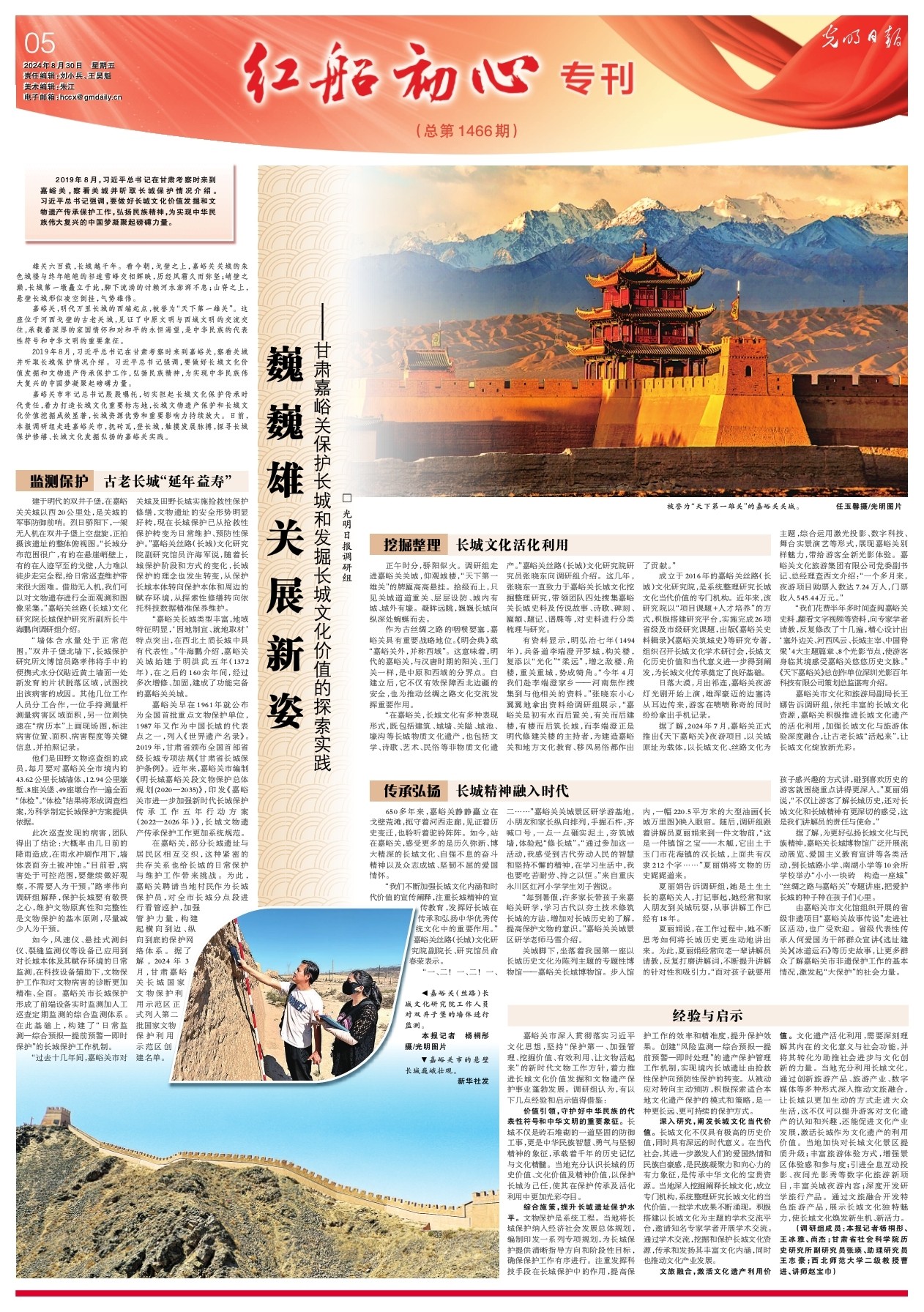 嘉峪關(guān)市牢記總書記殷殷囑托,切實擔起長城文化保護傳承時代責(zé)任,著力打造長城文化重要標志地,長城文物遺產(chǎn)保護和長城文化價值挖掘成效顯著,長城資源優(yōu)勢和重要影響力持續(xù)放大。日前,本報調(diào)研組走進嘉峪關(guān)市,撫磚瓦,登長城,觸摸發(fā)展脈搏,探尋長城保護修繕、長城文化發(fā)掘弘揚的嘉峪關(guān)實踐。