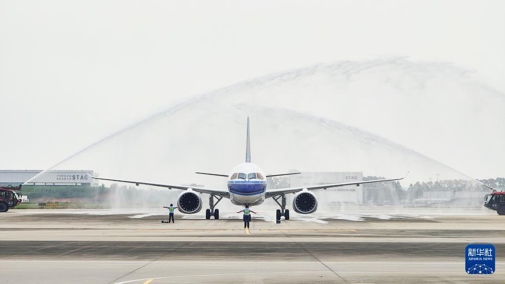 8月29日,南航首架C919國產(chǎn)大飛機(jī)在廣州白云國際機(jī)場(chǎng)緩緩穿過“水門”。新華社發(fā)