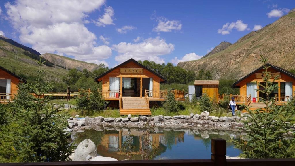 2023年7月起,安玉軍和幾戶村民改造自家院子,騰出開設(shè)農(nóng)家樂、牧家樂的房子,并打造燒烤和露營(yíng)基地。步入基地,幾池清水將基地分成不同區(qū)域,木屋、牙帳、露臺(tái)散布其間,人們環(huán)繞池間小路行走,周邊連綿的祁連山上松木成林,牛羊悠閑。