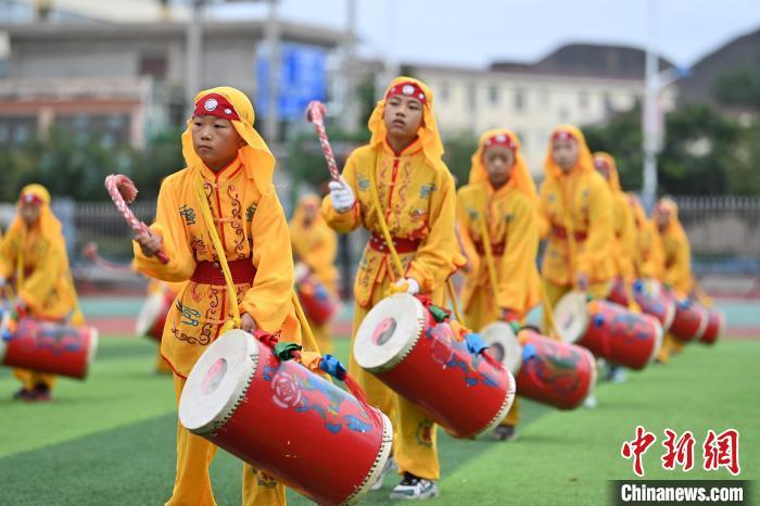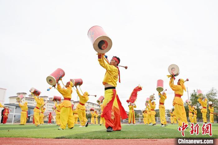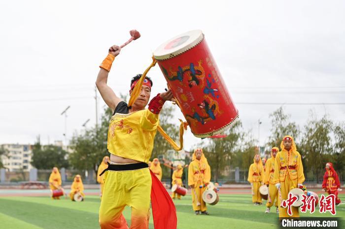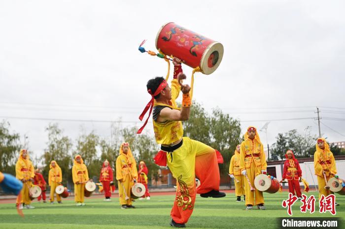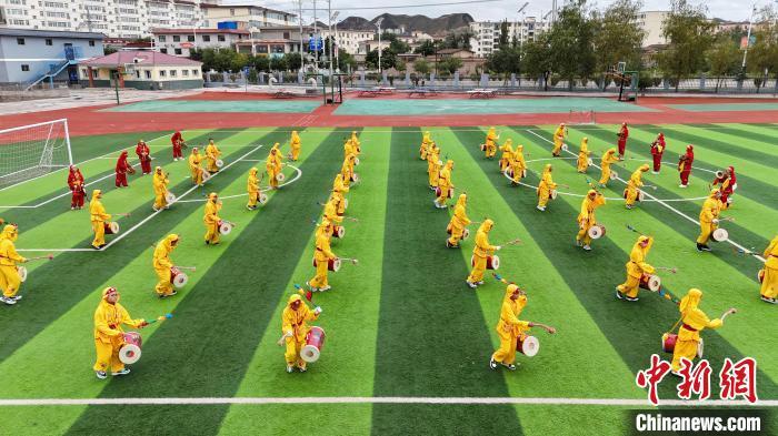 9月9日,甘肅省蘭州市皋蘭縣三川口學(xué)校學(xué)生練習(xí)蘭州太平鼓。近年來,皋蘭縣將國(guó)家級(jí)非物質(zhì)文化遺產(chǎn)蘭州太平鼓納入各中小學(xué)課后服務(wù)內(nèi)容,成立中小學(xué)太平鼓隊(duì)13支,定期邀請(qǐng)非遺傳承人走進(jìn)校園,進(jìn)行傳統(tǒng)文化授課和培訓(xùn),使學(xué)生親身感受中華優(yōu)秀傳統(tǒng)文化的魅力。蘭州太平鼓舞已有六百余年的歷史,素有“天下第一鼓”之稱,2006年被列入中國(guó)第一批非物質(zhì)文化遺產(chǎn)名錄。中新社記者 九美旦增 攝