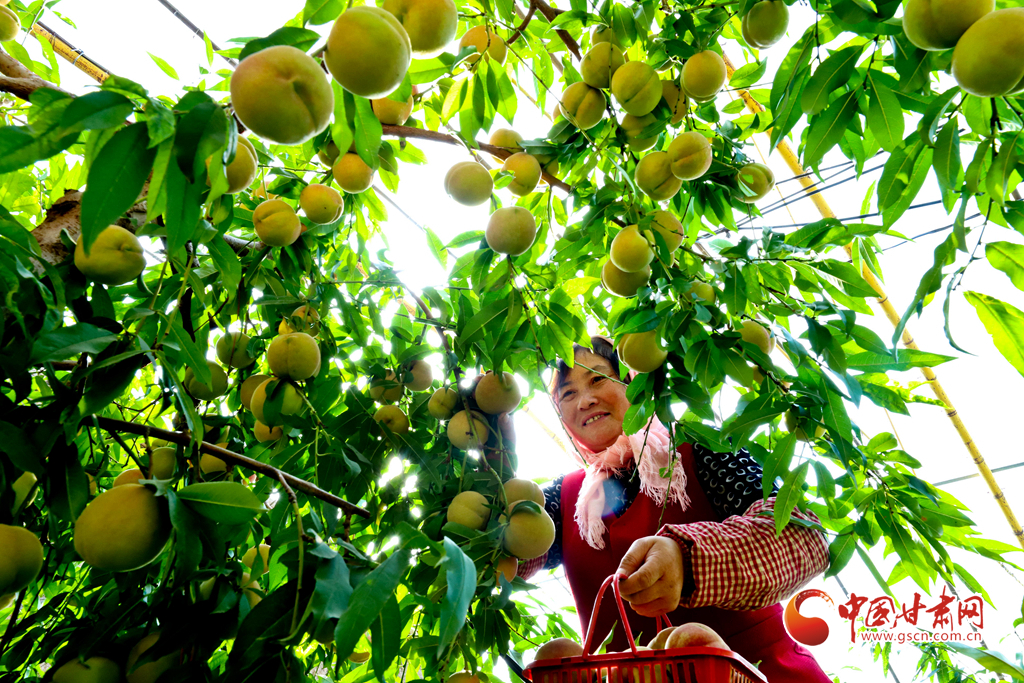 10月24日,在張掖市甘州區(qū)長安鎮(zhèn)萬通果蔬種植專業(yè)合作社“甘泉雪桃”種植基地大棚內(nèi),種植戶正在為甘肅蘭州和青海西寧的客戶采摘裝運(yùn)“甘泉雪桃”。