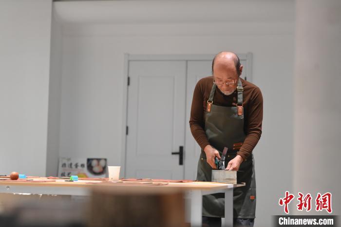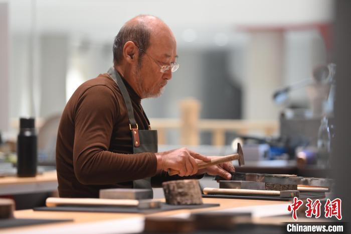 11月23日,甘肅省蘭州市楊樹珍剪紙工作室內(nèi),工匠名師劉金碌制作剪紙漢服作品的金屬帽邊。中新社記者 李亞龍 攝