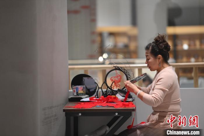 11月23日,甘肅省蘭州市楊樹珍剪紙工作室內(nèi),楊樹珍制作剪紙漢服。中新社記者 李亞龍 攝