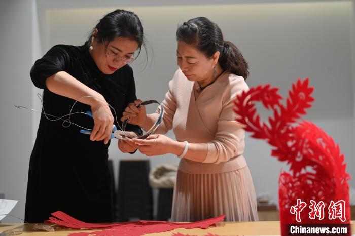 11月23日,甘肅省蘭州市楊樹珍剪紙工作室內(nèi),楊樹珍(右)帶領(lǐng)團(tuán)隊(duì)成員制作剪紙漢服。中新社記者 李亞龍 攝