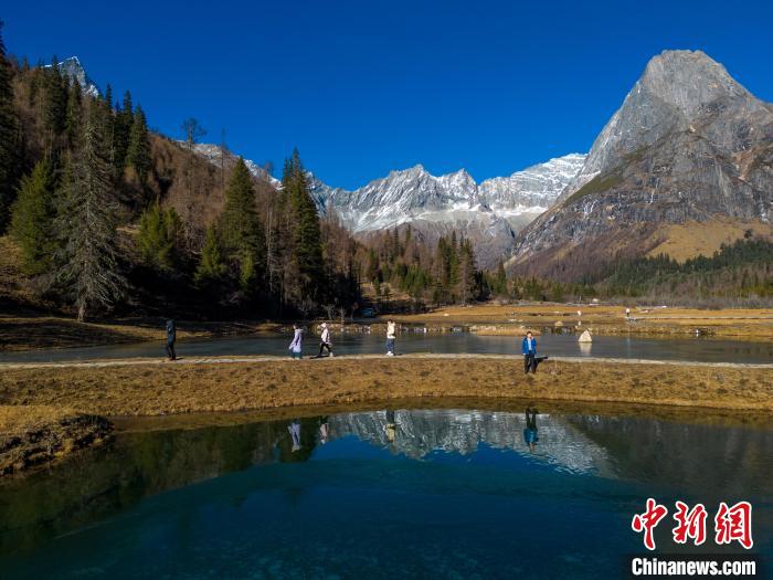 12月2日,位于四川省阿壩州小金縣的四姑娘山雙橋溝吸引游客游覽。隨著冬季到來(lái),四姑娘山雙橋溝多座山峰被皚皚白雪覆蓋,紅葉、雪山倒映在清澈的湖面形成一幅美麗畫(huà)卷,冰雪旅游逐漸火熱。中新社記者 張浪 攝