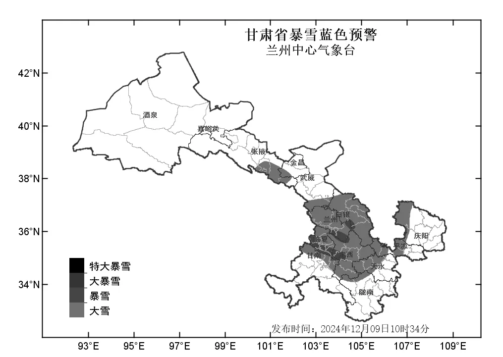 中國甘肅網(wǎng)12月9日訊(西北角·中國甘肅網(wǎng)記者 沈文剛)12月9日10時(shí)34分,蘭州中心氣象臺(tái)發(fā)布暴雪藍(lán)色預(yù)警,預(yù)計(jì)9日15時(shí)至10日20時(shí),蘭州、白銀、定西、臨夏等市州及甘南北部、天水西部、平?jīng)鑫鞑?、慶陽西部、張掖南部、武威南部將出現(xiàn)大雪;臨夏南部、定西西部、蘭州南部、白銀中部將出現(xiàn)暴雪。