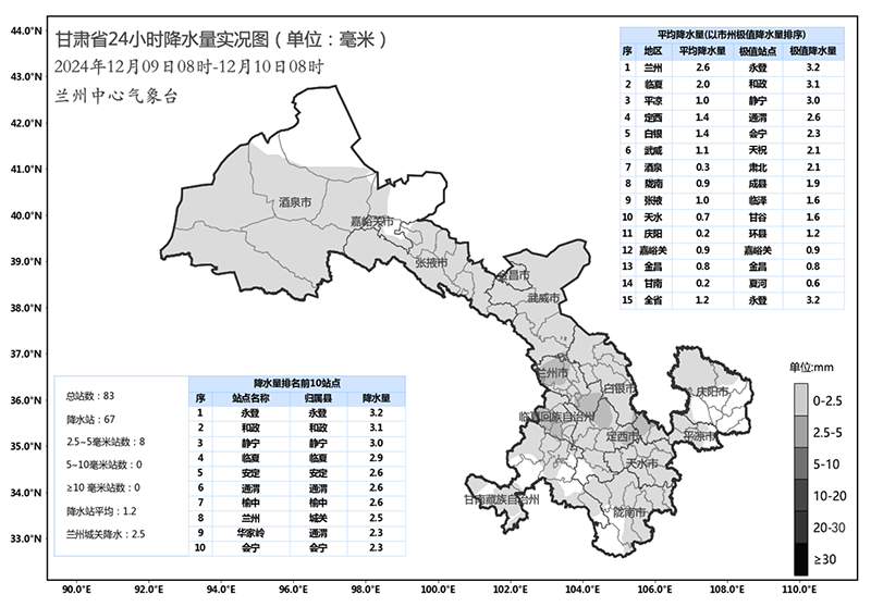 中國甘肅網(wǎng)12月10日訊(西北角·中國甘肅網(wǎng)記者 沈文剛)12月9日8時至12月10日8時,全省共計67個縣區(qū)出現(xiàn)降雪,其中蘭州南部、臨夏南部、平?jīng)鑫鞑?、定西東部局部地方出現(xiàn)中雪。目前,較大累積降雪量出現(xiàn)在永登3.2mm、和政3.1mm、靜寧3.0mm、臨夏2.9mm、通渭2.6mm。蘭州本站降水2.5mm。