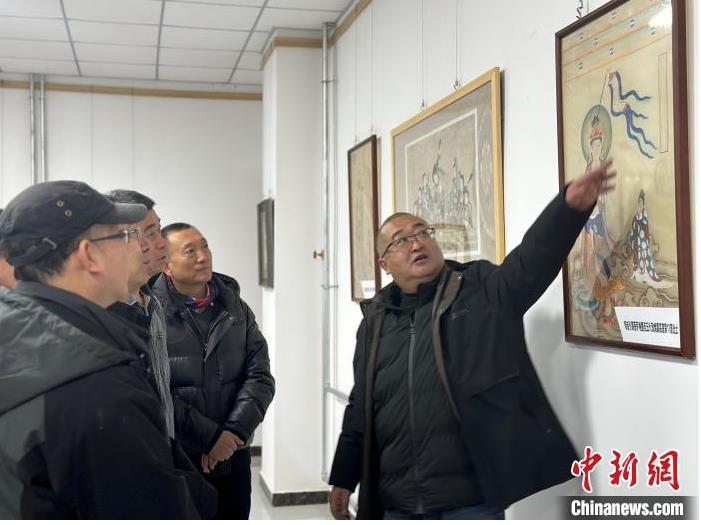 12月17日,由蘭州市七里河區(qū)委宣傳部、七里河區(qū)文體旅局聯(lián)合舉辦的“大漠孤陽映彩霞 敦煌神韻美如畫”新時(shí)代文明實(shí)踐主題活動(dòng)暨敦煌巖彩畫書畫藝術(shù)展拉開帷幕。圖為展覽組織者為參觀者講解展出的作品。楊娜 攝