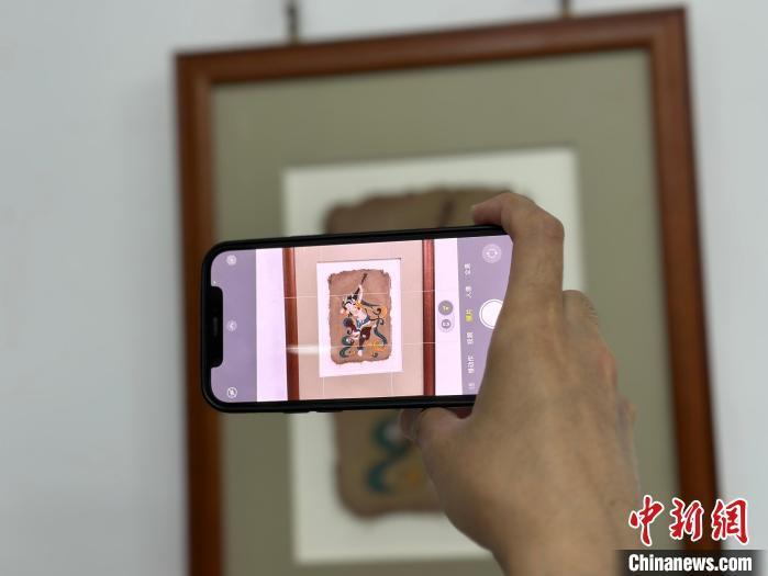 12月17日,由蘭州市七里河區(qū)委宣傳部、七里河區(qū)文體旅局聯(lián)合舉辦的“大漠孤陽映彩霞 敦煌神韻美如畫”新時(shí)代文明實(shí)踐主題活動(dòng)暨敦煌巖彩畫書畫藝術(shù)展拉開帷幕。圖為參觀者拍攝展出的“反彈琵琶”題材巖彩畫。楊娜 攝