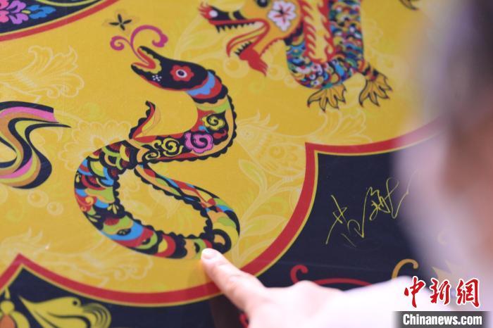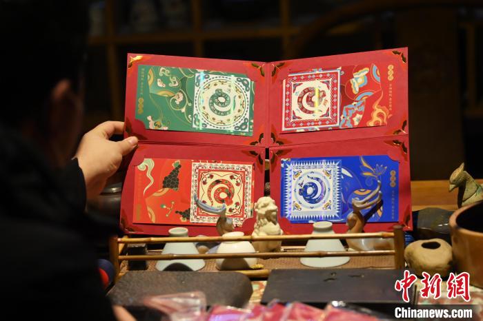 1月10日,在甘肅省敦煌市敦煌畫院內(nèi),游人參觀由敦煌畫院設(shè)計(jì)授權(quán)的中國郵政《敦煌福蛇》極限型明信片。中國郵政《敦煌福蛇》極限型明信片從敦煌壁畫里的藻井汲取靈感,集合敦煌紋樣、民藝剪紙等中國傳統(tǒng)藝術(shù)內(nèi)容,以春萌蛇、夏長蛇、秋實(shí)蛇、冬藏蛇對應(yīng)著四季祝福。中新社記者 李亞龍 攝
