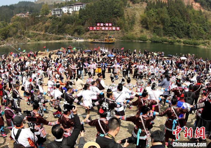 2024年3月11日,在廣西三江侗族自治縣梅林鄉(xiāng),“二月二”侗族大歌節(jié)活動(dòng)吸引游客前來體驗(yàn)侗鄉(xiāng)風(fēng)情。圖為民眾在跳多耶舞。 吳練勛 攝