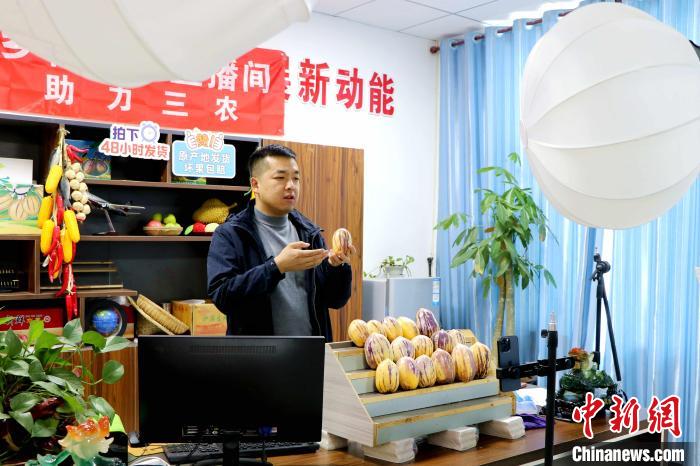 “民勤人參果,清甜多汁,營養(yǎng)豐富,五斤大果僅售29塊9。”12日晚,甘肅省武威市民勤縣“95后”小伙張煜文在自家的直播工作室對(duì)著鏡頭展示新鮮的人參果,同時(shí)回答直播間里消費(fèi)者的各種問題。