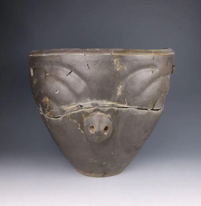 然而,馬家窯人的藝術(shù)創(chuàng)造力似乎遠不止于此。寺洼遺址新出土的眾多陶器展現(xiàn)出全新的造型與紋飾風格。如其中一件帶有“豬鼻”的馬家窯類型泥質(zhì)灰陶,色澤深沉灰黑如夜,一只鼻子自陶胎中緩緩隆起,上方的弧形紋理像舒展的眉骨,又像張開的羽翼,一場古文明的夢境由此展開。