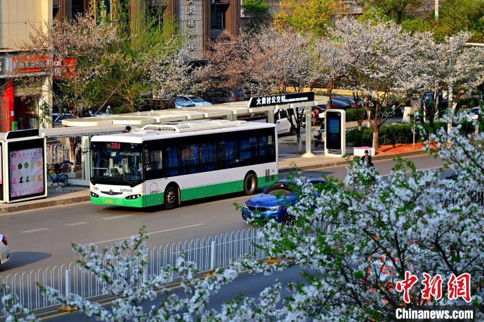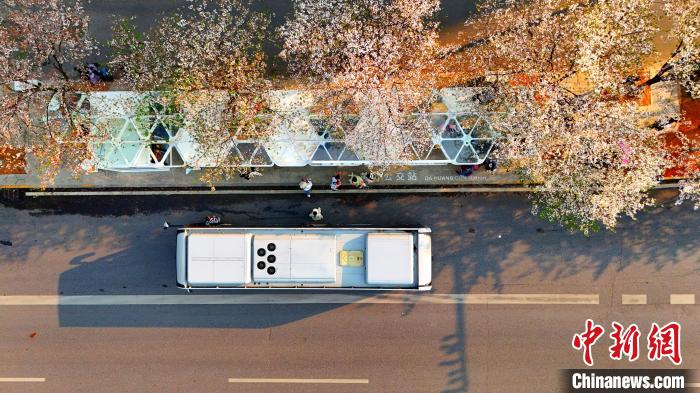 3月26日,被譽為武漢“最美櫻花車站”的珞喻東路大黃村公交站櫻花盛放。經(jīng)過改造的大黃村公交站,新增了自助售貨機、衛(wèi)生間、共享充電寶等便民設(shè)施,煥然一新的科技智慧站臺與粉白如霞的櫻花相映生輝。微風(fēng)吹過,櫻花花瓣浪漫飄零,吸引不少市民游客觀賞“打卡”。圖為公交車在珞喻東路大黃村公交站停留。(無人機照片)劉康 攝
