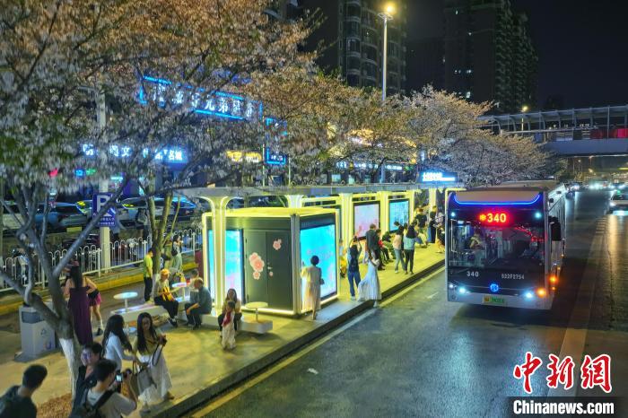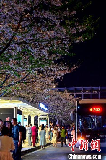 圖為夜間的珞喻東路大黃村公交站,櫻花在光影中呈現(xiàn)別樣魅力。劉康 攝