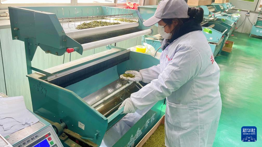 文縣溢品茗茶葉種植農(nóng)民專業(yè)合作社生產(chǎn)車間負責人袁素花正在查看茶葉炒制情況。新華社記者李杰 攝