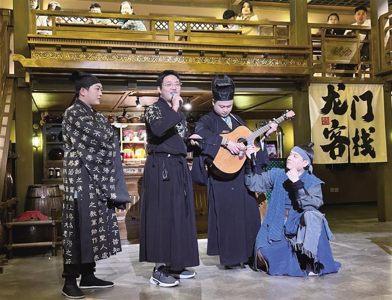 “諸位小友近來(lái)可好?”“好!”在街區(qū),NPC們與游客的互動(dòng)成為一大亮點(diǎn)。為了讓游客更好地沉浸其中,街區(qū)里的“蘭裳閣”專門(mén)提供服裝出租和妝造設(shè)計(jì)服務(wù)。游客們?cè)谶@里換上漢服、做好造型,“穿越”成古人與NPC們共同沉浸在這場(chǎng)歷史旅行中。張偉彥在“龍門(mén)客棧”工作快半年了,飾演店小二馬一刀。他對(duì)角色有著自己的理解:“導(dǎo)演讓我演店小二,大家印象里店小二都是機(jī)靈、腿腳快的。但我演的這個(gè)店小二帶著江湖氣息,他藏在龍門(mén)客棧,其實(shí)是個(gè)刀客,在這里打工是為了打探消息,畢竟龍門(mén)客棧可是江湖消息的聚集地。”記者走在街區(qū),時(shí)不時(shí)就能看到他拿著草帽,熱情地招呼游客玩接帽子游戲。遇到靦腆不敢嘗試的游客,他也會(huì)不斷鼓勵(lì),有時(shí)候碰上外國(guó)游客,他還隨口說(shuō)幾句英語(yǔ)與其互動(dòng)。