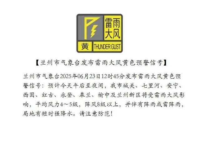 蘭州市氣象臺(tái)2025年06月23日12時(shí)45分發(fā)布雷雨大風(fēng)黃色預(yù)警信號(hào):預(yù)計(jì)今天午后至夜間,我市城關(guān)、七里河、安寧、西固、紅古、永登、皋蘭、榆中及蘭州新區(qū)將受雷雨大風(fēng)影響,平均風(fēng)力4~5級(jí),陣風(fēng)8級(jí)以上,并伴有陣雨或雷陣雨,局地有短時(shí)強(qiáng)降水。請注意防范!