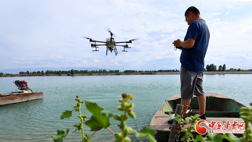 6月24日,在高臺(tái)縣夾溝湖水庫(kù)螃蟹養(yǎng)殖基地,無人機(jī)操作手啟動(dòng)設(shè)備,載滿飼料的無人機(jī)沿預(yù)設(shè)航線在800多畝螃蟹養(yǎng)殖基地上空精準(zhǔn)投喂。