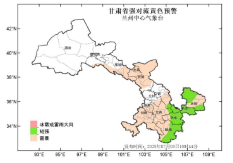 蘭州中心氣象臺2025年7月3日10時44分繼續(xù)發(fā)布強對流黃色預(yù)警:預(yù)計未來24小時,張掖、金昌、武威、蘭州、白銀、甘南、臨夏、定西、隴南、天水、平?jīng)觥c陽等州市有雷暴,其中隴南、天水、平?jīng)?、慶陽等市部分地方及白銀、定西兩市局部地方有短時強降水,最大小時雨強20-60mm;隴南、天水、平?jīng)觥c陽等市強降水在未來24小時內(nèi)多發(fā),白銀、定西主要強降水時段在4日2-8時。請注意防范!