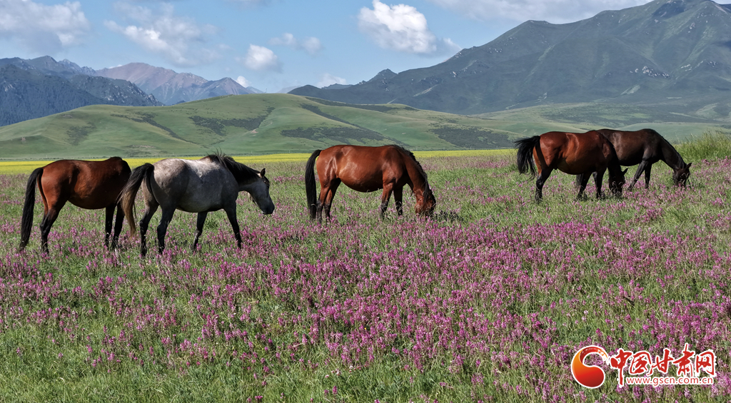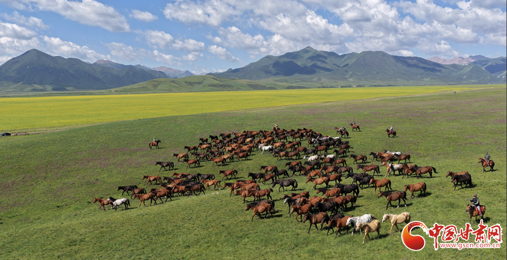 8月12日,在張掖山丹馬場,一場駿馬奔騰的壯闊景象震撼上演。藍(lán)天如洗,白云似絮,遠(yuǎn)處連綿的山巒勾勒出雄渾的天際線,腳下黃綠交織的草原如巨幅織錦般鋪展。成群棕白相間的駿馬,似靈動音符躍動于綠野,騎手身姿矯健,與奔騰的馬群、遼闊的天地渾然一體,盡顯草原的壯美景象。