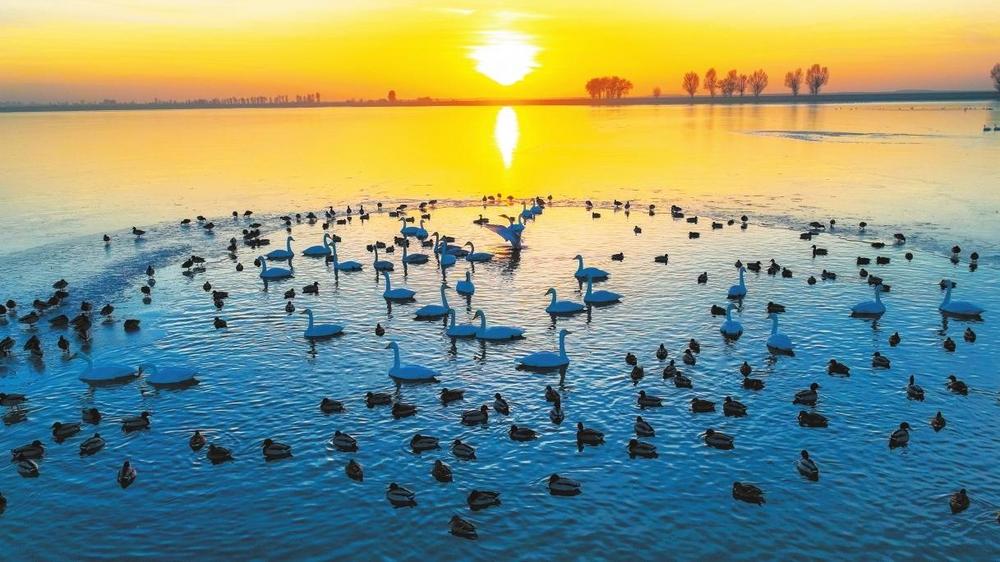11月20日,甘肅金塔縣芨芨水庫濕地,遷徙越冬的白天鵝、赤麻鴨成群翔集湖面,成為初冬一道靚麗風(fēng)景。近年來,金塔縣持續(xù)改善生態(tài)環(huán)境,加強(qiáng)濕地保護(hù)與修復(fù)工作,為水鳥提供了理想的棲息場所,每年在此棲息的候鳥多達(dá)數(shù)萬只。 奔流新聞·蘭州晨報通訊員 曹紅祖 李鵬 段金龍 攝