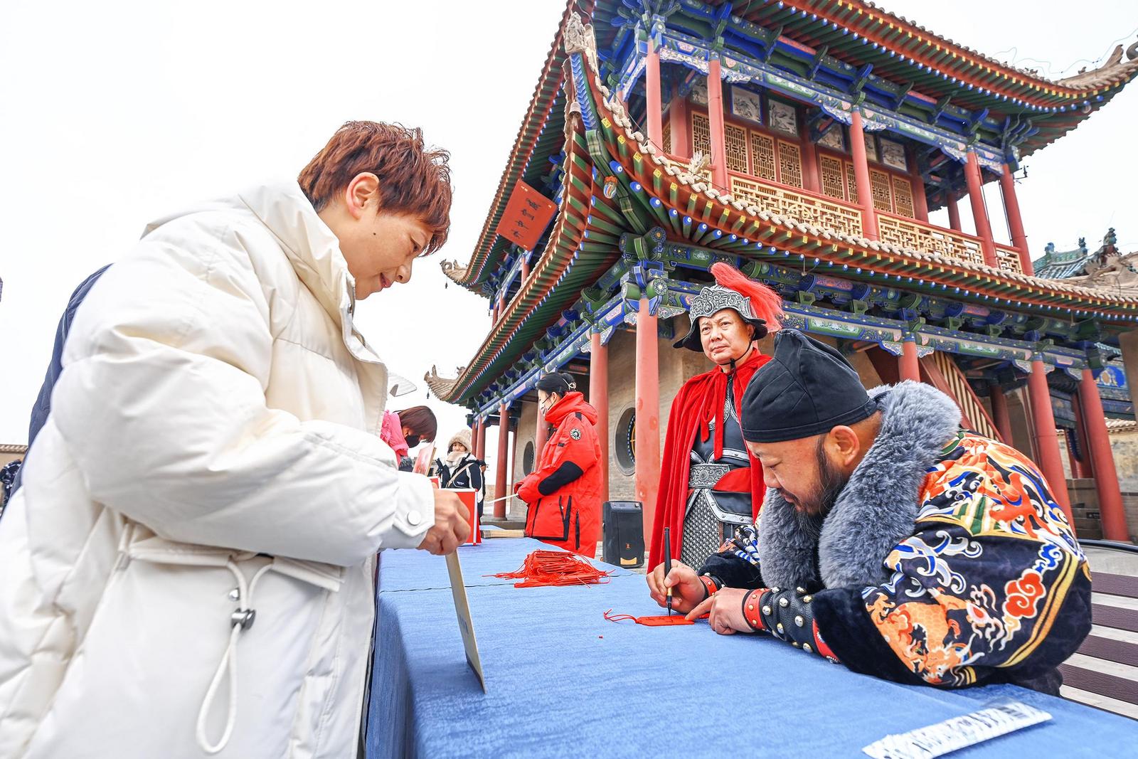 文昌閣前,關(guān)長(zhǎng)李森現(xiàn)場(chǎng)揮毫潑墨,在“福”牌上書(shū)寫(xiě)吉祥寄語(yǔ),將美好祝福送到市民游客手中,引得大家紛紛駐足領(lǐng)取。最熱鬧的要數(shù)非遺社火展演,表演者從東閘門(mén)出發(fā),沿著馬道登上城墻巡游。鏗鏘的鑼鼓、喜慶的表演,讓千年雄關(guān)充滿(mǎn)新春氣息。除此之外,趣味投壺、古關(guān)猜物等傳統(tǒng)互動(dòng)游戲,也吸引了眾多游客踴躍參與。大家在祈福墻上鄭重寫(xiě)下心愿,寄托對(duì)新一年的美好期盼。